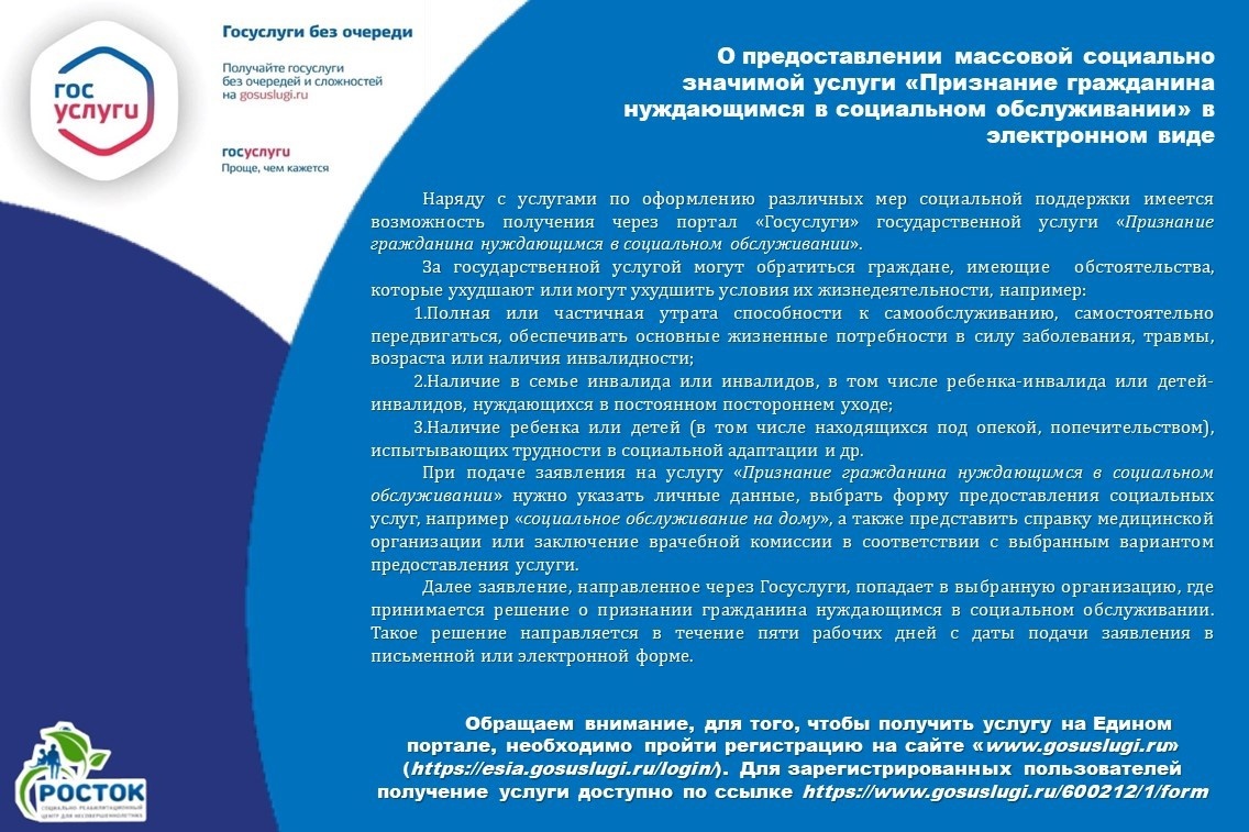 19 мая 2025 «ПРИЗНАНИЕ ГРАЖДАНИНА НУЖДАЮЩИМСЯ В СОЦИАЛЬНОМ ОБСЛУЖИВАНИИ» О предоставлении массовой социально значимой услуги «Признание гражданина нуждающимся в социальном обслуживании» в электронном виде.