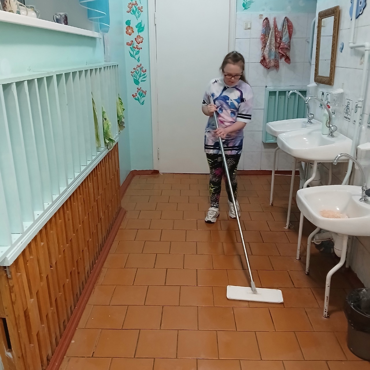 17 января 2025 Мои первые бытовые обязанности Воспитатели учат мальчишек и девчонок правильно мыть пол и посуду, пользоваться моющими средствами.