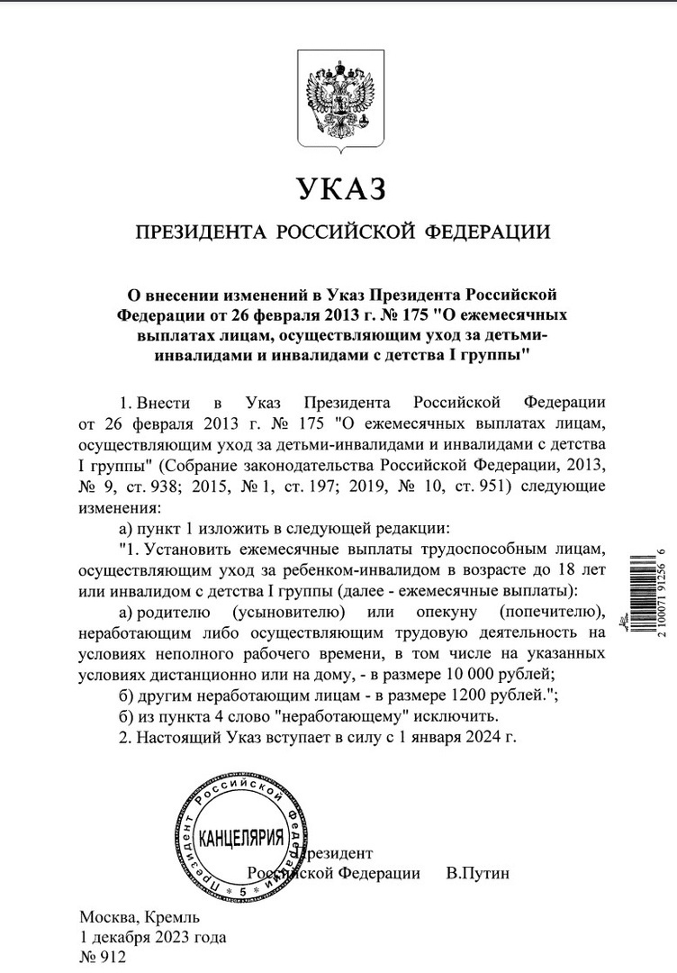 Внесены изменения в Указ о ежемесячных выплатах лицам, осуществляющим уход за детьми-инвалидами и инвалидами с детства I группы